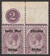 1927-30 'S.W.A.' opt Union Building 2d grey & maroon, top marginal bilingual blk of 4, LL stamp 'without stop after A'. VF fresh M/MUH, variety pr MUH. Scott 99/99c cat US$95 for M. SG 60/60ca cat £99 for M prs, should be at least double £189 MUH for this blk. (P)