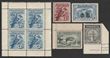 1934 Victorian Centenary set 2d (perf 10½), 3d & 1/- (perf 11½). Ash imprint blks of 4, the 2d is the very rare terra cotta shade & a normal single vermilion is inc for comparison, there are 2 blks of the 3d, one with variety 'flag on tower'. Fresh VF MUH. SG 147a-149(var). ACSC 151B, 155d, 156 cat $2500+. Scarce imprint blks. (20) (P)