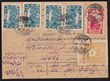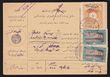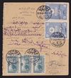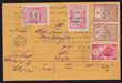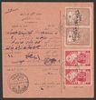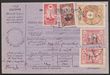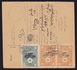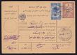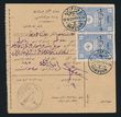1920 Parcel Card franked Nationalist Govt 'Osmanli Postalari 1336' opt Notarial Fiscal 50Pi 1921 Ministry of Finance 5Pi (2) & 1921 Hejaz Railway 1Pi, plus Pictorial 20pa -all cut as per PO rules tied by 'Eski Shehr' cds, with 'Yozgad' arrival b/s. Mi 708, 740 & 752, SG A31, 59 & 78 cat £200 as loose stamps & with several times on card. Nice mixed franking. (P) |