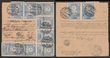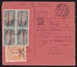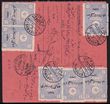 1921 Parcel Card franked Nationalist Govt 'Osmanli Postalari 1337' opt Religious Tribunal Fiscal 5Pi (6) -all cut as per PO rules, tied by 'Samsoun 10 11 21' cds, with 'Boul Vadin' arrival b/s. Mi 730, SG A39 cat £2850 as loose stamps alone & worth several times on card. (P) |