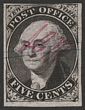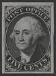1845 New York Postmaster Provisional 5c black Washington, initialled ACM with A&C connected. VFU, 4 margins, blue pen cancel. Scott 9X1a cat US$525. SG 65 cat £500. Scarce classic. 2001 PF/NY photo-cert. (P) |