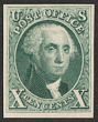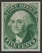 1847 Washington 10c green, trial colour proof on thin card, imperf, instead of black issued colour, for Atlanta Exhibition. Superb UN as made, 4 margins. SG 2(p) cat £35,000 as normal. Sc 4TC4d cat US$450 (normal cat US$37,500). Only 1 sheet printed. (P) |