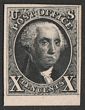 1847 Washington 10c black, plate proof on card, imperf, in issued colour. Superb UN as made, 4 margins. SG 2(p) cat £35,000 as normal. Sc 4PU cat US$250 (normal cat US$37,500). (P) |