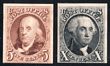 1848 Franklin 5c brown & Washington 10c black, plate proofs on card, imperf, in issued colours. F-VF UN as made, almost all 4 margins. SG 1-2(p) cat £42000 as normals. Sc 3P4-4P4 cat US$500 (normals cat US$43,500). (2). (P) |