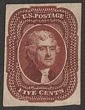1851-57 Jefferson 5c red brown, plate proof on wove paper, imperf in issued colour. Fresh UN as made, tiny thins 4 margins, & superb appearance. SG 14(p) cat £2750 on normal. Sc 12TC5c cat US$1500 (normal cat US$30,000). Virtually identical to issued stamp so fantastic space filler for normal mint collection. 2021 PSAG photo cert (P) |