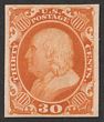 1857-61 Franklin 30c orange, plate proof on card, imperf, in issued colour. Superb UN as made, 4 margins. SG 42(p) cat £2250 as normal. Sc 46P4 cat US$50 (normal cat US$1900). |