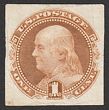 1847 Franklin 5c red-brown, plate proof on card, imperf, in issued colour. Superb UN as made, 4 margins. SG 1(p) cat £7000 as normal. Sc 3PU cat US$250 (normal cat US$6000). (P) |