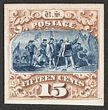 1873 Official Justice 15c brown trial colour proof on thin card, imperf, instead of purple issued colour, for Atlanta Exhibition. VF UN as made, 4 margins. SG O210(p) cat £475 as normal. Sc O31TC4c cat US$37 (normal cat US$500). |