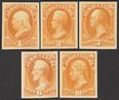 1873 Official Agriculture 1c-10c yellow plate proofs on card, imperf, in issued colours. VF UN as made, all 4 margins. SG O180-0184(p) cat £1550 as normals. Sc01P4-05P4 cat US$50 (normal cat US$1600). (5). |