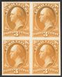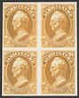 1873 Official Agriculture 24c yellow blk of 4, plate proofs on card, imperf, in issued colours. Superb UN as made, all 4 margins. SG O187(p) cat £1700 as normals. Sc O8P4 cat US$40++ (normal cat US$1700). Scarce multiple. (4). |