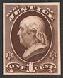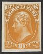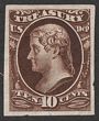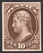 1873 Official Treasury 10c brown, plate proof on India paper, imperf, in issued colour. VF UN as made, 4 margins. SG O255(p) cat £250 as normal. Sc O77P3 cat US$20 (normal cat US$240). |