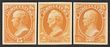 1873 Official Agriculture 15c, 24c & 30c yellow plate proofs on card, imperf, in issued colour. VF UN as made, all 4 margins. SG O186-0188(p) cat £1400 as normals. Sc07P4-09P4 cat US$30 (normal cat US$1400). (3). |