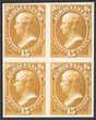 1873 Official Agriculture 15c yellow blk of 4, plate proofs on card, imperf, in issued colour. Superb UN made, all 4 margins. SG O186(p) cat £1700 as normals. Sc O7P4 cat US$50++ (normal cat US$1700). Scarce multiple. (4). |