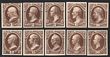 1847 Washington 10c brown, trial colour proof on thin card, imperf, instead of black issued colour, for Atlanta Exhibition. Superb UN as made, 4 margins. SG 2(p) cat £35,000 as normal. Sc 4TC4c cat US$450 (normal cat US$37,500). Only 1 sheet printed. (P) |