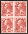 1873 Official Interior 2c vermilion blk of 4, plate proofs on card, imperf, in issued colours. Superb UN as made, all 4 margins. SG O195(p) cat £280 as normals. Sc O17P4 cat US$50+ (normals cat US$280). Scarce multiple. (4). |