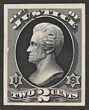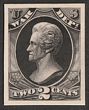 1873 Official Justice 2c black trial colour proof on thin card, imperf, instead of purple issued colour, for Atlanta Exhibition. VF UN as made, 4 margins. SG O205(p) cat £300 as normal. Sc O26TC4a cat US$43 (normal cat US$310). |