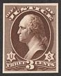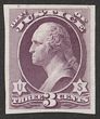 1873 Official Justice 3c purple, plate proof on India paper, imperf, in issued colour. VF UN as made, 4 margins. SG O206(p) cat £325 as normal. Sc O27P3 cat US$20 (normal cat US$300). |
