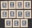 1873 Official Navy Dept set 1c-90c grey-blue, small DIE PROOFS on wove paper on grey card, 32x39mm, in grey-blue instead of issued ultramarine colour, from Roosevelt presentation album. Superb fresh UN as made, all 4 margins. SG O214-O224(p) cat £3500 as normals. Sc O35P2-O45P2 cat US$1100 (normal cat US$4040). Very rare proof set. (11) (P) |