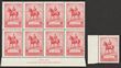 1937 NSW Sesquicentennial 2d scarlet left cnr marginal blk of 8 with varieties 'man with tail' (SG cat £800, ACSC cat $1500) & 'pantaloon flaw' (ACSC cat $1500). Fresh VF MUH. SG 193a(var). ACSC 175e & f cat $3000+. Superb blk with both major varieties. 2025 Ceremuga AIEP photo cert. (8) (P)