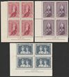 1938 KGVI Robes set 5/-, 10/- & £1 thin paper by Authority imprint blks of 4, 5/- is tinted paper. Fresh VF MUH. SG 176a-178a(var). ACSC 213z, 215z, 217z cat $1475. (3 blks) (P)