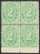 1906-08 Completed Design 2d emerald wmk Crown over single A, single-line perf 11.5-12x11 blk of 4 with error IMPERF at base between margin. Superb fresh VF MUH. SG D47(var). ACSC D50Ba cat $10,000 for M singles should be at least double, MUH $20,000. ACSC states "There is a mint blk of 4 & a pr in Royal collection. A mint single is recorded in private hands & others may exist". This is a new discovery of a second blk of 4 & the only multiple available to collectors. Ex Sandy. 2025 Ceremuga AIEP photo cert. (4). (P) |