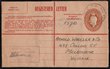 Lettercard: 1911-12 KGV Fullface 1d sepia 1st line ends 'any' on pale green stock, rouletted, view Sheep Station Wimmera. FU, Blumberg pmk, text side unevenly suntanned, view side superb fresh. ACSC LC5(122A) cat $750. Rare. (P) |