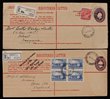 Registered Envelopes: 1914-67 used range with Kangaroo 4d uprated (ACSC RE3B), 1916-20 KGV 4d uprated use of old NSW stock (RE6A & 8), 1920-21 KGV 5d old NSW stock (RE10A), 1921 new format 5d straight edge flap (RE11A & B), 1922 curved flap (RE12), 4½d surch (RE17 & 17d), 1928-30 oval die 4½d violet both sizes (RE21 & 22), same with 5d surch (RE24B & 25), KGVI oval die 5d 3 diff (RE 29-31), QEII 1/7 (RE 38), 2/5, 24c & 25c (RE 42, & 45-6). F-VFU. ACSC cat $1273+ with some very interesting usages. (20). |