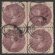 1861-88 QV Coin 5/- rose-lilac blk of 4, perf 11. F-VFU, Sydney 88 cds, plus barred oval pmk. Scott 44U cat US$600+. SG 181 cat £560+. Very rare multiple. (P) |