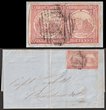 1857 Folded letter wrapper franked QV Diadem 1d orange-red pr, & QV Registered vermilion & Prussian blue, imperfs, tied by barred numeral '85' of Drayton. To Ipswich with b/s of Drayton & Ipswich. SG 102 & 109 cat £204+ as loose stamps alone & 'from x3' on cover. Rare usage that previously sold for $900+ in a 2008 Melbourne auction. |