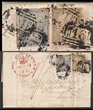 1851-54 Folded letters etc with 1851 cover franked QV Laureate 2d greyish blue 4 margins, tied barred numeral '57' of Raymond Terrace. 1853 2d ultramarine, 4 margins tied by barred numeral '65' of Wollombi. 1854 2d ultramarine tied by barred numeral '12' of Cowra. Various crowned oval or cds b/s. SG 52, 55, & 58 cat £114+ as loose stamps alone, & 'from x2' on covers. (3). |
