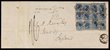1857 long folded letter franked QV Laureate 1d orange-vermilion blk of 4 & pair (irregularly separated) tied by barred numeral '104' of Sofala. To England with 'Paid 9 MY 9 1857/ b/s 'SYDNEY NEW SOUTH WALES JA 19 1857' SOFALA, & Wigton arrival . SG 83 cat £240+ as loose stamp alone & from x2' on cover. (P) |