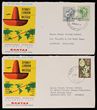 1954 Australia - Nth America QANTAS 1st Regular Flights, (2), Sydney - San Francisco & return both with multi-coloured vignettes. AAMC 1345 a, 1345 b(var) cat $120 as 2 loose vignettes.