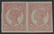 1895 QV 2½d pale carmine, horiz pr, imperf plate PROOF, blank background, 2 cnr numerals on bluish granite paper, no wmk. Superb UN as made, 4 large margins. SG 213(p). ACSC Q23(PP)1B cat $1000+. Very rare. (2) (P)