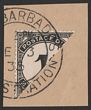 1934-47 Postage Due 1d black, diag BISECT (UL half). VFU, on piece with 'GPO Barbados 3 FE 35 Registration' cds. Scott J2a cat US$2500, SG D2a cat £1800 both for on cover. Very rare example from genuine postal usage. (P) |