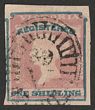 1854-55 QV Registered 1/- rose-pink & blue, imperf. VFU, 4 margins, oval 3av pmk. Scott F1 cat US$225. SG 34 cat £225. (P)