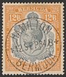 1924-32 KGV 12/6 grey & orange. Superb U, full 'Hamilton 12 SEP 34' cds, W/C. Scott 97 cat US$300. SG 93 cat £400. Scarce in used condition. (P) |