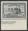 1949 'O.H.M.S.' opt Harvester 20c slate, LL cnr marginal plate 1 blk with inscription, LR stamp variety 'missing stop after S'. Superb fresh MUH. SG O128/O128a cat £342+ as singles. Unitrade O8/O8a cat C$400+. (P) |