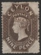 1861-64 QV 9d deep brown, wmk Large Star, rough perf 14-15½. VF fresh M. Scott 32 cat US$160. SG 33 cat £180. (P) |
