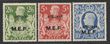 1943-47 'MEF.' opt KGVI 2/6, 5/- & 10/-, opt SPECIMEN. VF fresh MUH. SG M19s-21s est cat £550 as specimens. Rare genuine opts & certificate can be obtained on request. (3) (P)