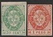 1865 Arms 50c green, type A & 1P vermilion. VF UN, all 4 margins. Scott 40 & 42 cat US$245. SG 36 & 38 cat £215. (2) (P) |