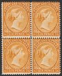 1891-1902 QV 6d orange-yellow positional blk of 4, wmk Crown CA reversed, positions 26, 27, 36, 37 with annotated characteristics. VF fresh 3M/1MUH, 1 tiny thin. Scott 16 cat US$220 as singles. SG 33x cat £360 for singles plus premium for positional blk. (P) |