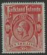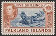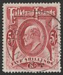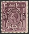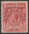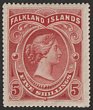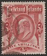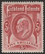 1904-12 KEVII 5/- red. VFU with post 'POST OFFICE/(Crown)/FALKLAND ISLAND' in brownish. SG 50 cat £180+++. (P) |