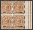 1918-20 'WAR STAMP' opt KGV 1/- yellow-brown, right marg blk of 4 with REVERSED ALBINO opts in margin. VF fresh MUH. Heijz 37a V1 cat £800+ for M singles, should be at least double, £1600+, plus premium for positional blk. SG 72(var). Very rare as only 1 pane was recorded. 2025 Ceremuga photo cert. (P) |