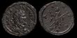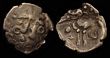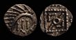 Iceni, Ecen c10-45AD AR Unit (1.19g), 12mm. Ecen symbol Y (Icenian J) type. Double crescent emblem on vertical wreath, rev Stylised horse right, pellets above & below ECEN monogram below. aVF. S-443B, cf ABC 1684, VA-730-1.