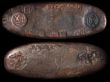 ND (1736-1818) Gembun era Chogin Edo mint 6 official stamps to the body. 167.83g, 90x33mm. C-9, JNDA 09-66, H-9-38. Various chopmarks front & back from different periods during its circulation of approx 150 years. Hartill - Very Rare. (P)