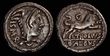 C. Vibius Pansa Caetronianus. BC 48. Silver Denarius (3.95g).Mask of bearded Pan to r.; PANSA below; Rev. Jupiter Axurus (or Anxurus) seated to l., holding patera in right hand, sceptre in l.; C?VIBIVS?C?F?C?N downwards to r., IOVIS?AXVR upwards to l.GVF. slightly off centre.Crawford 449/1a; Babelon (Vibia) 18; Sydenham 947. (P)
