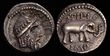 Julius Caesar. BC 46-45. Silver Denarius (3.97g). Issued BC 49-48. Moving mint with Caesar.Elephant to right trampling on serpent, CAESAR in exergue, border of dots, rev. simpulum, sprinkler, axe and priest's hat all in dotted circle.gEF, Rare and exceptionally well-centred for the issue. Struck on excellent metal and with a light iridescent tone. A wonderful Denarius!S.1006, C.443./1, BMC Gaul 27, Sear Julius Caesar 49 [p.111]).One of the most popular types Caesar minted were of an elephant stepping on a serpent, with CAESAR in the exergue. Although there is no clear record of what these coins allude to, this design is believed to commemorate Caesar's victory in the Battle of Thapsus in 46 BC, where he defeated the forces of his political rival, Pompey, so efficiently that it was like an elephant stepping on a snake and could be seen as good defeating evil. On the reverse, he included important pontifical religious implements, a reminder to the Roman people that he was a pious man, and that he held numerous religious positions, such as Pontifex Maximus (Highest Priest). This series of coinage effectively communicated Caesar's dual image as a capable military leader and a custodian of Roman tradition, helping to consolidate his support base and establish his legitimacy during the tumultuous events of the civil war.Cf; Heritage auctions, A61373, Lot, 22001, Hammer price US$18000 (P)