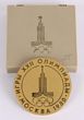 1980 Moscow XXII Olympic Games Commemorative medal. Athlete with Olympic torch, rev Moscow emblem of Olympia. Yellow metal, 60mm. Cased with repaired hinge.