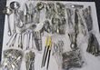 Silver plate. Cutlery. Various makers & styles c1930s-60s. Inc forks (various types), spoons (various), knives, sharpening steels, carving forks, carving knives, ice tongs, serving ladles. Bagged & sorted by style/pattern. G-VGC. (216)