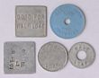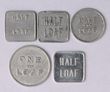 Bread Tokens: Paterson & Everson ½ loaf alum, Wangi Bakery ½ loaf alum, JE Woodland ½ loaf alum, Woonona Industrial Coop Soc Ltd 1 & ½ loaf alum. All rarity 3 less than 20 known. (5)